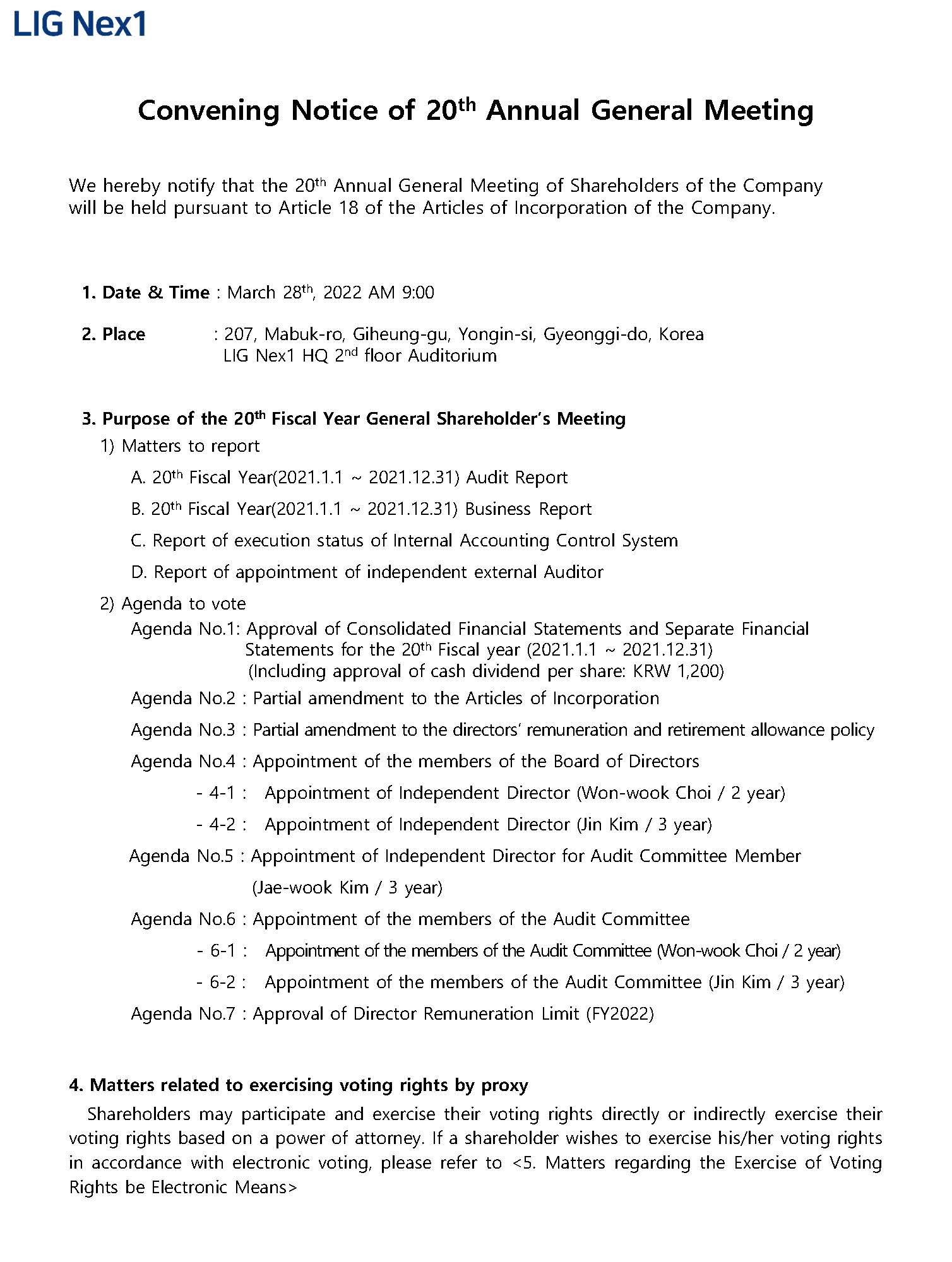 Convening Notice of 20th Annual General Meeting